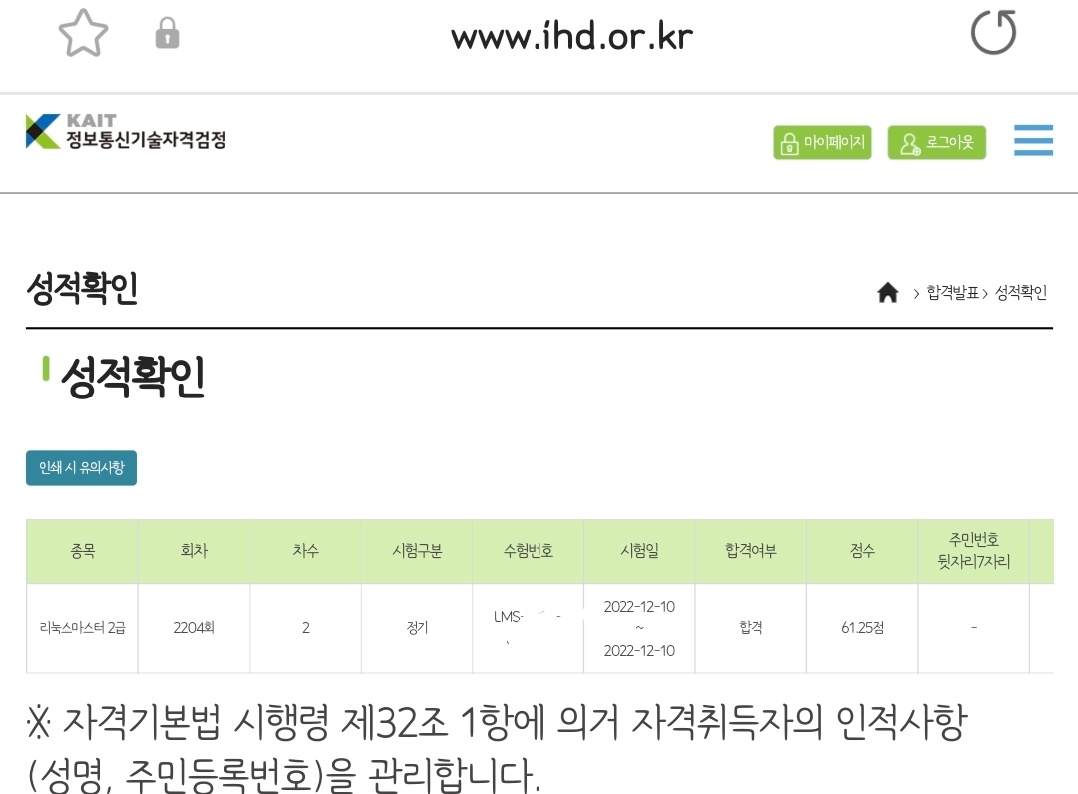 2022년 04회 리눅스마스터 2급 시험에 응시해서 합격했다.