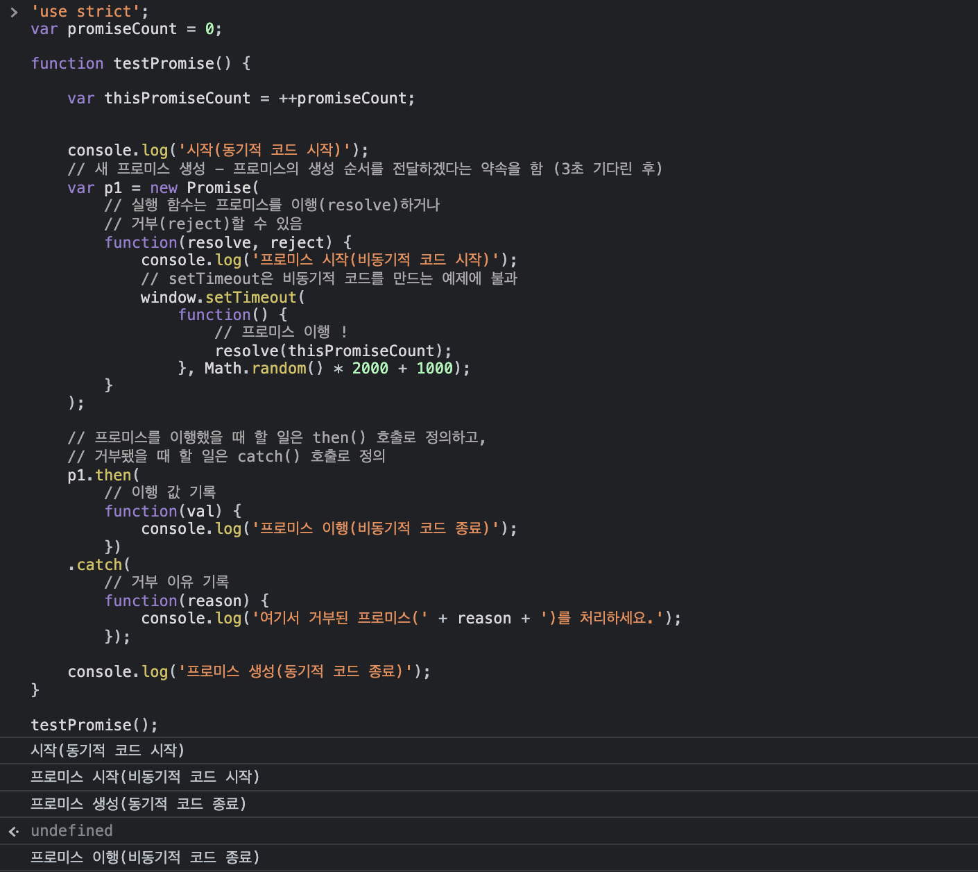 console.log('프로미스 이행(비동기적 코드 종료)');