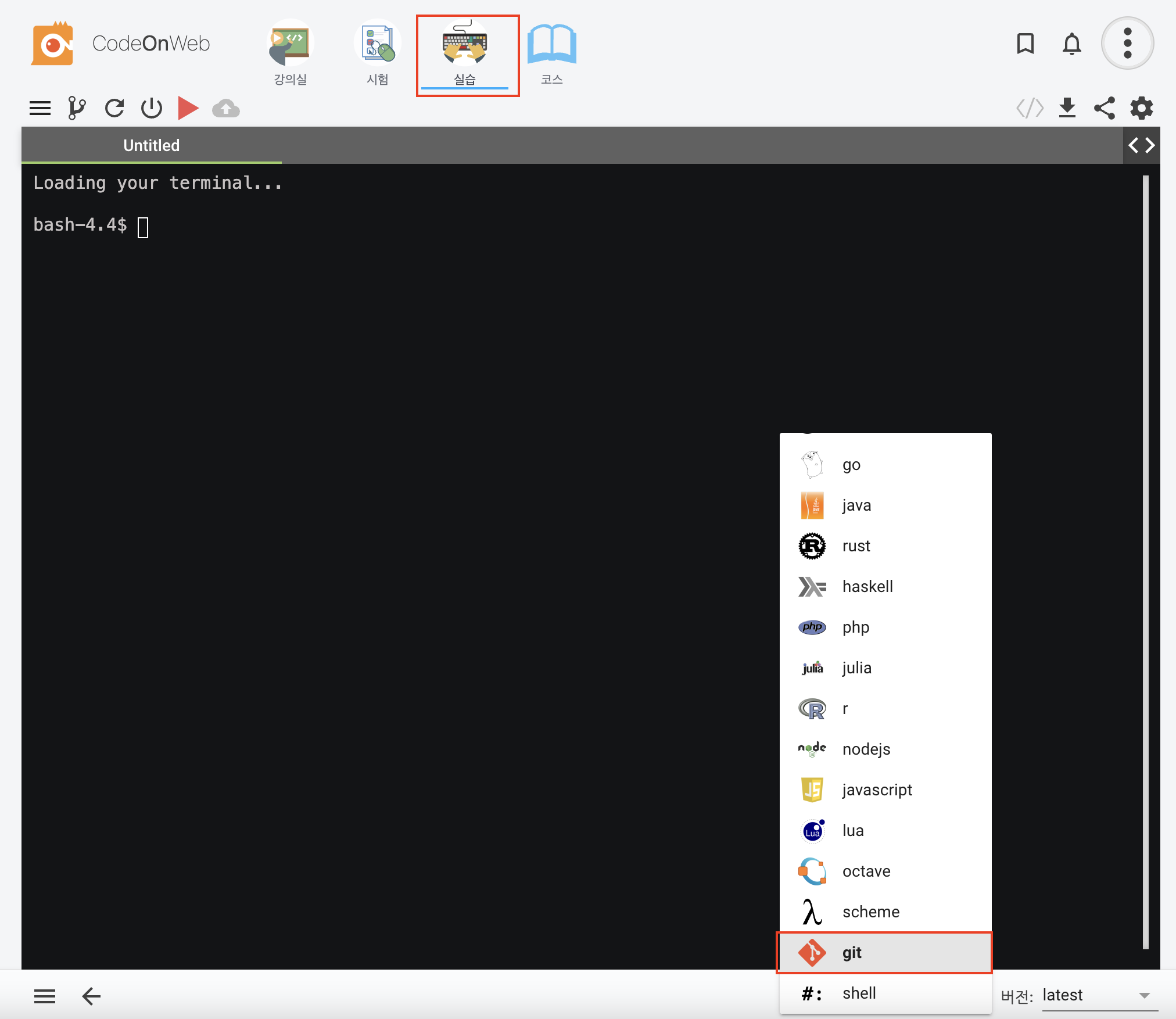 2. 실습 > 하단 우측에서 git을 선택해준 뒤 연습하면 된다.