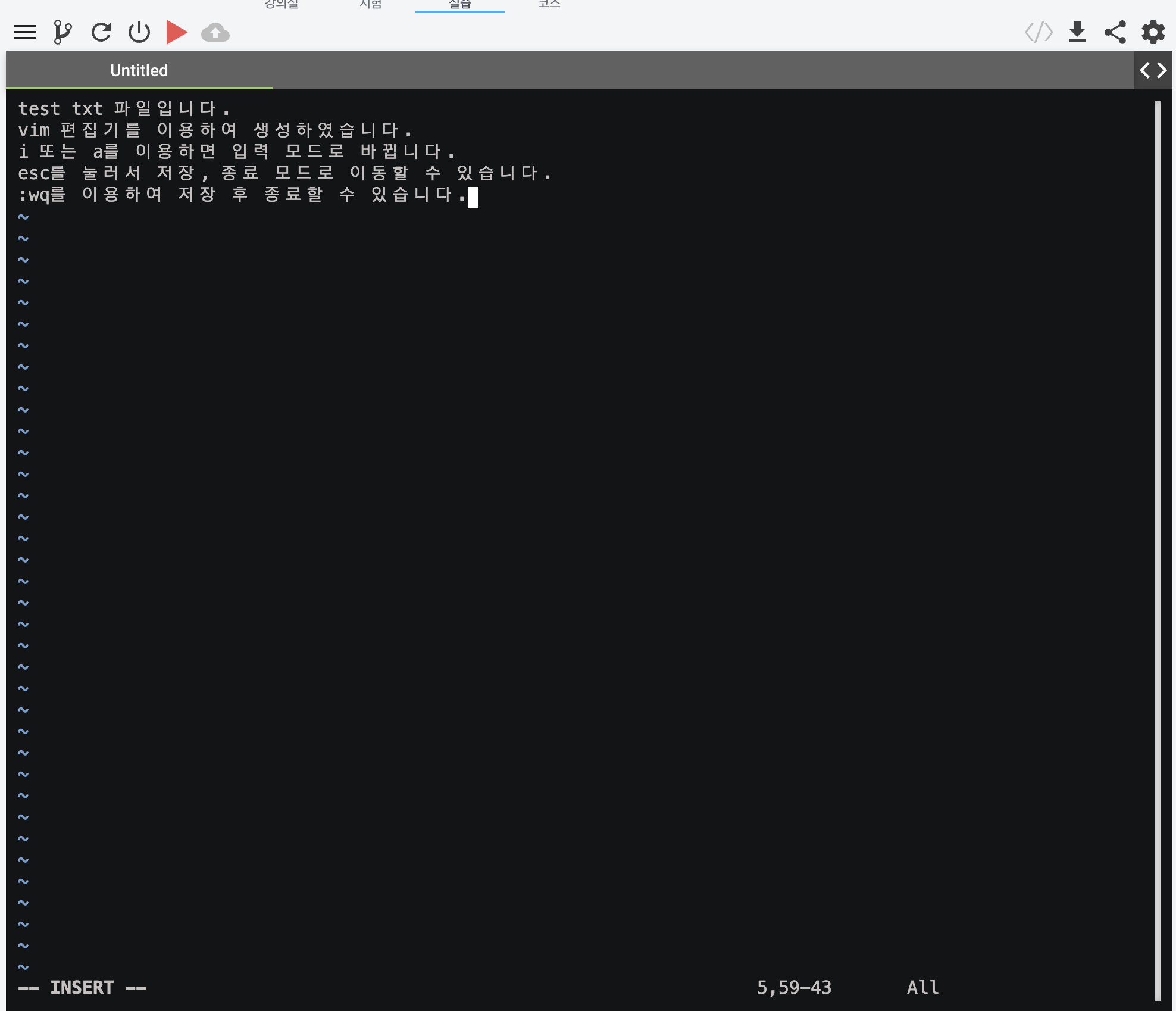 2) vim에서 텍스트를 입력하려면 ex 모드에서 'I' 나 'A' 를 눌러서 입력 모드로 변경해줘야 한다.