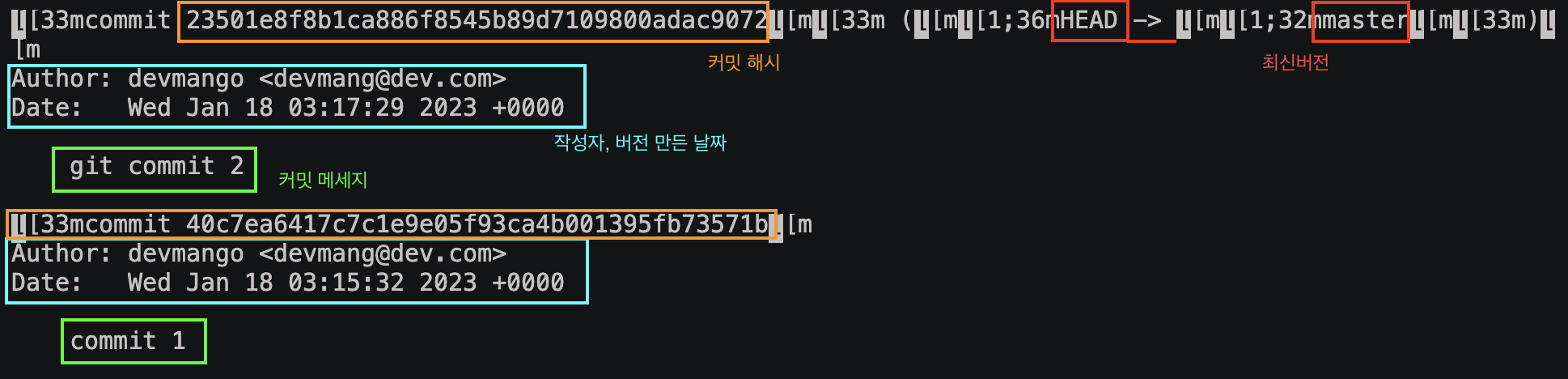 커밋 해시 : commit이라는 항목 옆에 영문과 숫자로 된 긴 문자열로 포현되며, 이것을 커밋 해시(commit hash) 또는 깃 해시(git hash)라고 한다. 커밋을 구별하는 아이디 개념이다.
