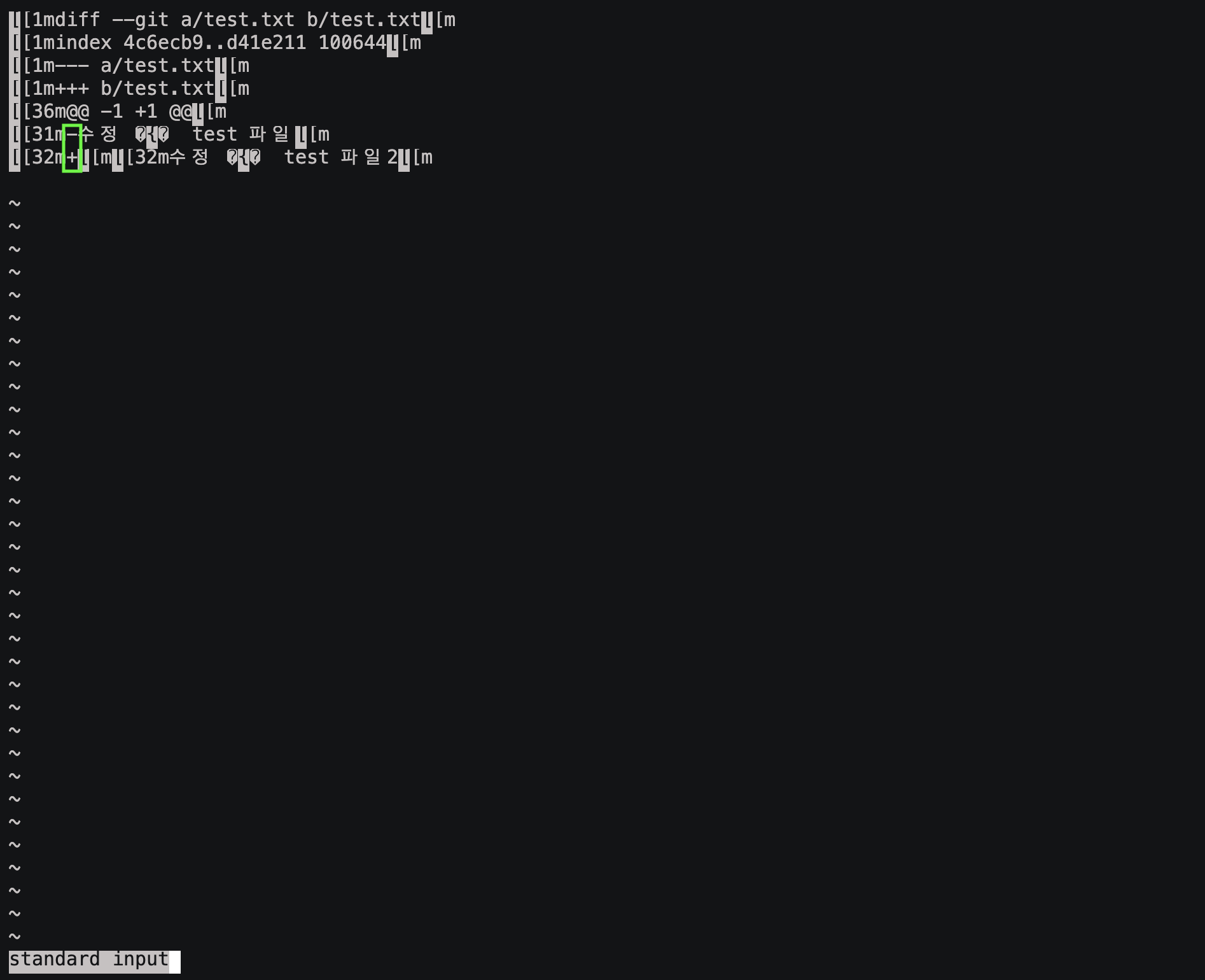 -는 최신 버전과 비교할 때 test.txt 파일에서 해당 내용이 삭제되었다는 뜻이고, +는 test.txt 파일에 해당 내용이 추가되었다는걸 뜻한다.git diff를 이용해 수정한 파일과 최신 버전을 비교한 다음, 수정한 내용으로 버전을 만드려면 스테이지에 올린 후 커밋하면 된다.