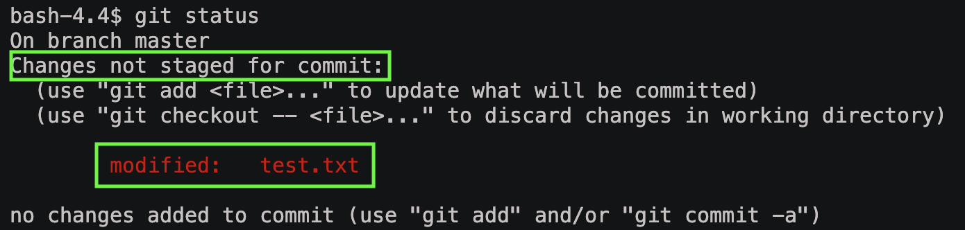 2) 내용 수정 후 git status 명령어를 입력해서 상태를 확인하면 test.txt 파일이 수정되었으나, 아직 스테이징 상태가 아니라고 나온다.
