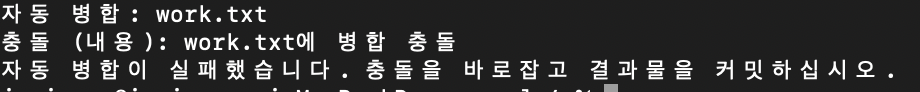 8) git merge 명령어를 사용해 o2 브랜치를 master 브랜치로 끌어온다. 이전에 git merge 명령을 실행했을 때처럼 자동으로 vim 이 열리지 않고 메세지가 나타난다. 이 메세지는 work.txt를 자동으로 병합하는 동안 충돌(conflict)이 발생했다는 뜻이다.