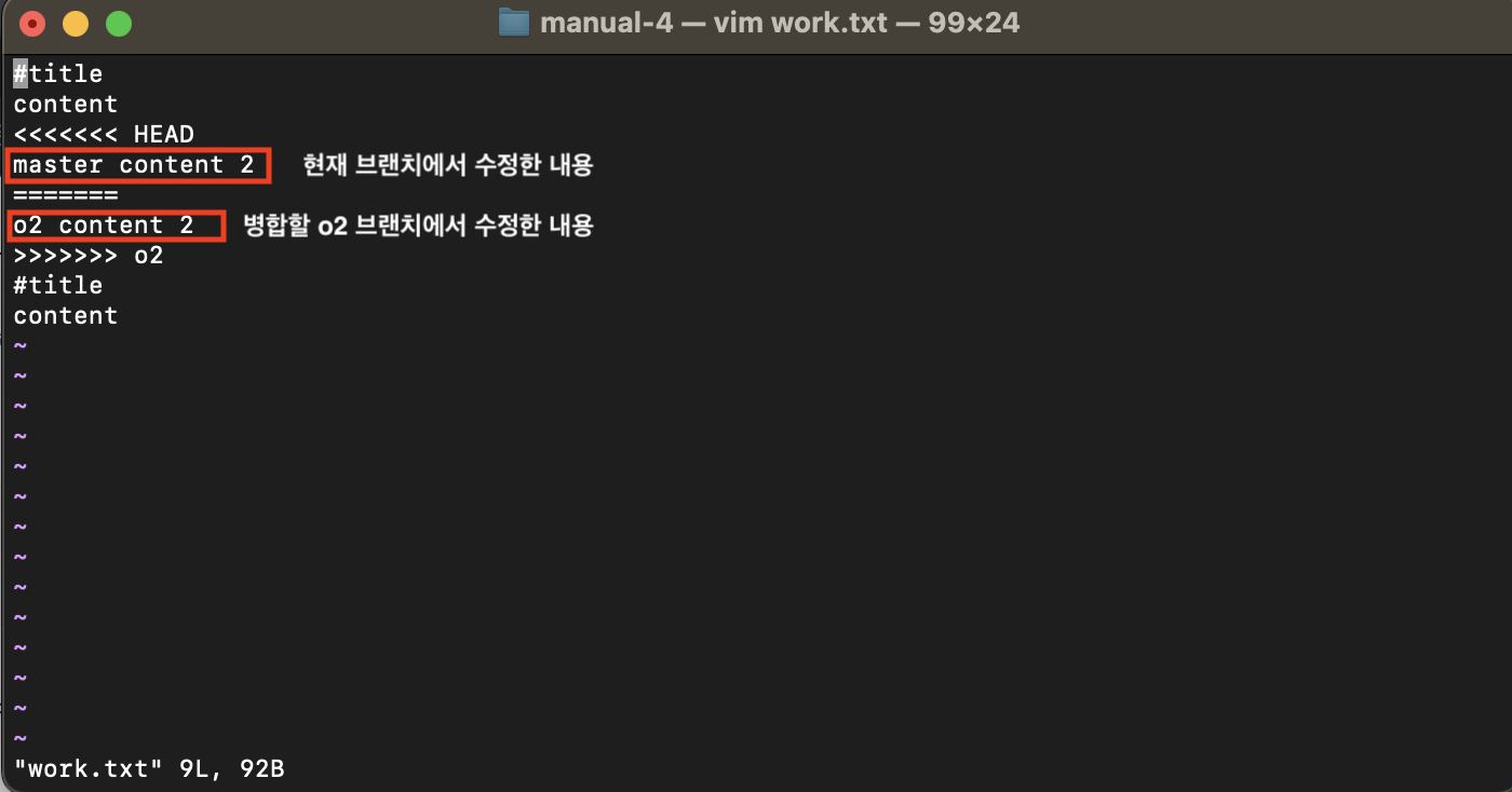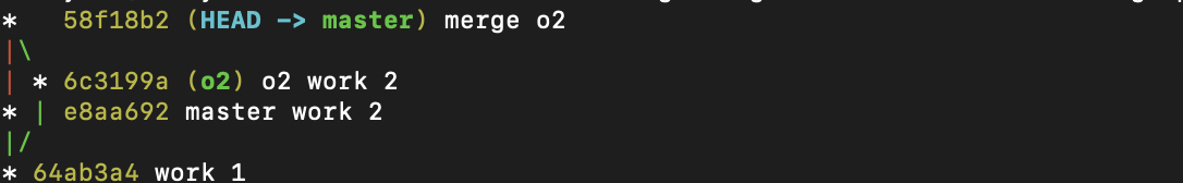 즉, o2와 master 두 브랜치에 work.txt 가 존재한다.