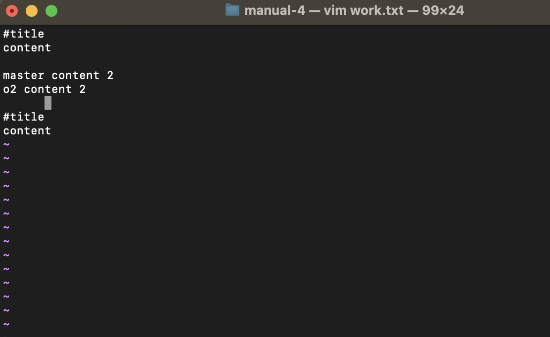 6) o2 브랜치로 checkout 한 뒤, work.txt 파일을 아래와 같이 수정한다. 그리고 'o2 work 2'로 커밋한다.