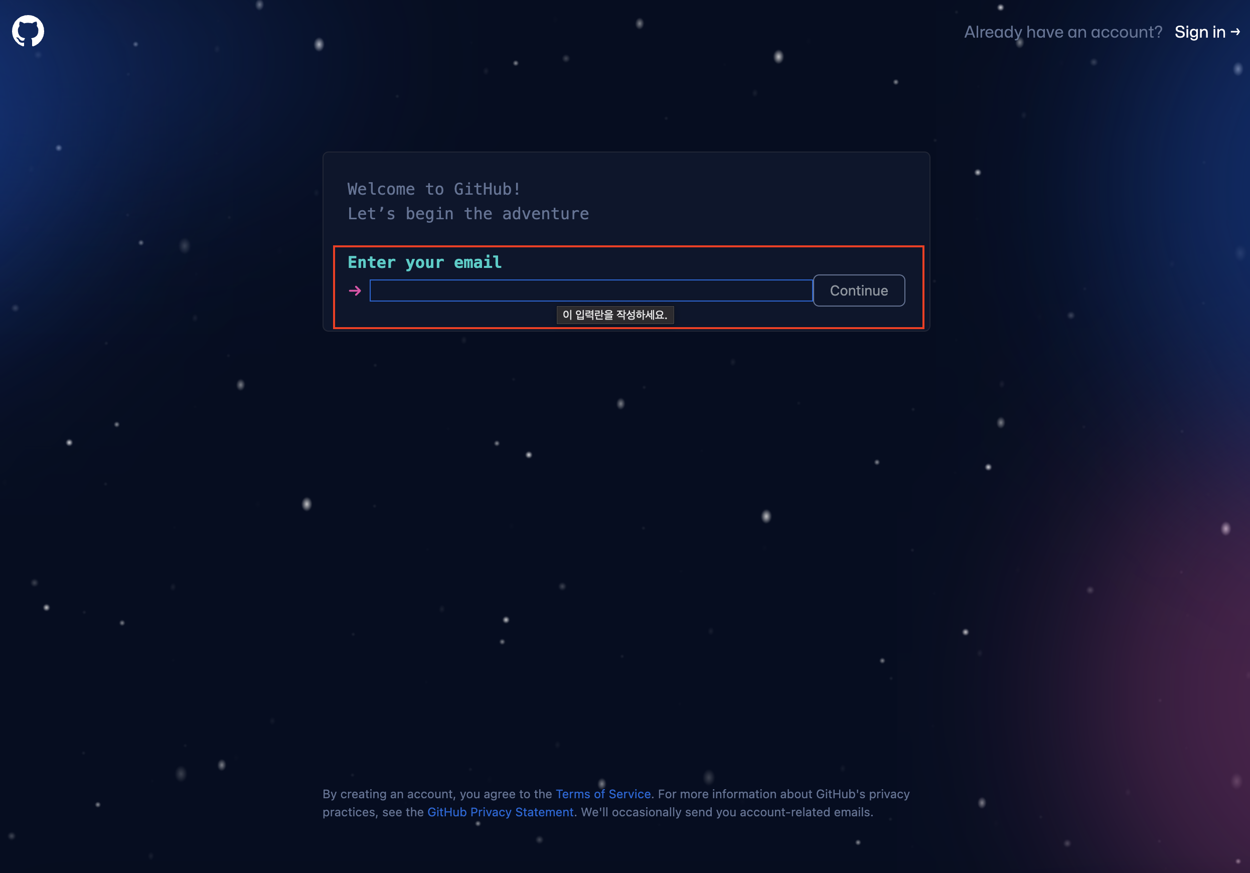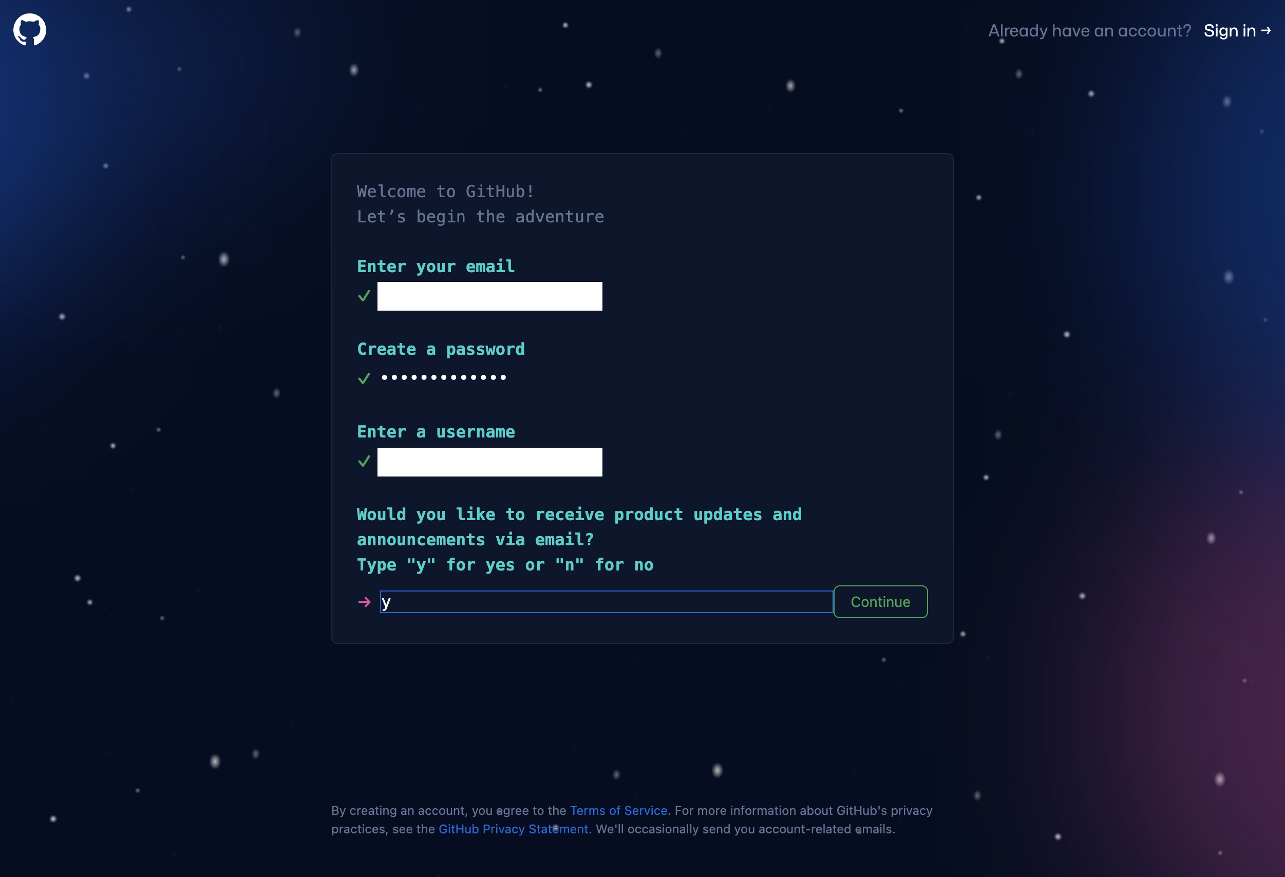 예인 경우 "y"를 입력하고 아니요인 경우 "n"을 입력한 뒤 Continue 버튼을 클릭한다.
