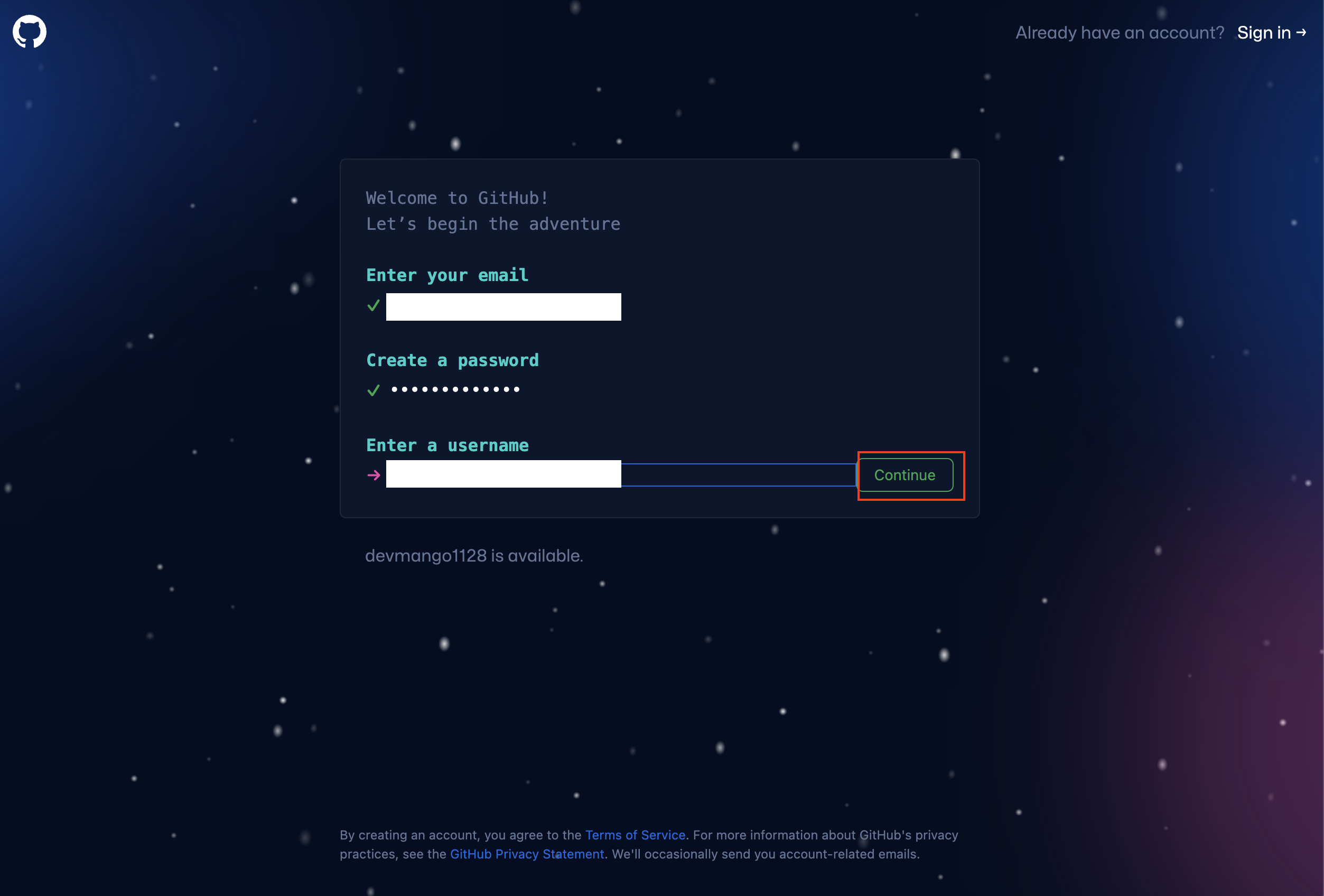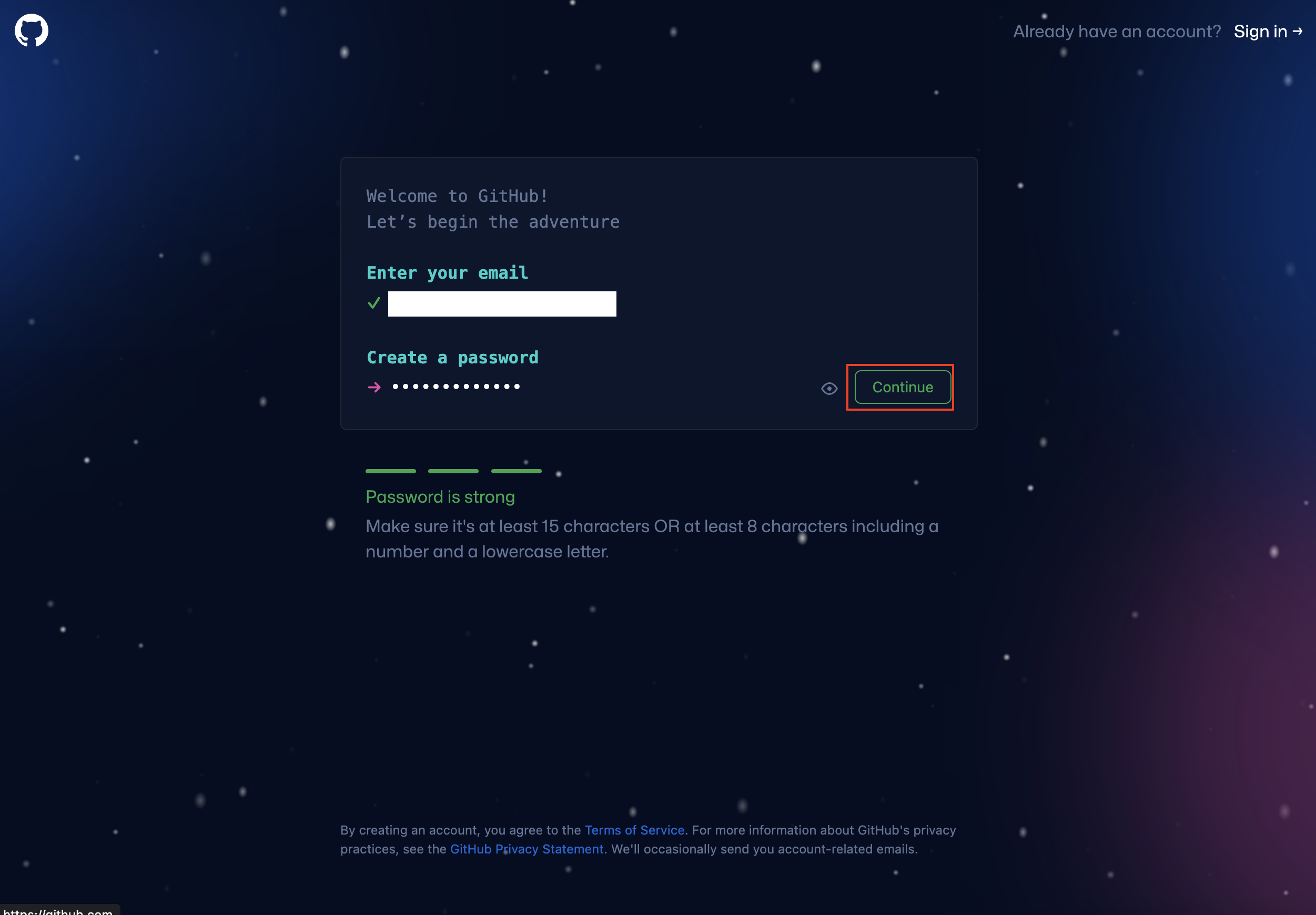3. 패스워드를 입력한 뒤 Continue 버튼을 클릭한다.