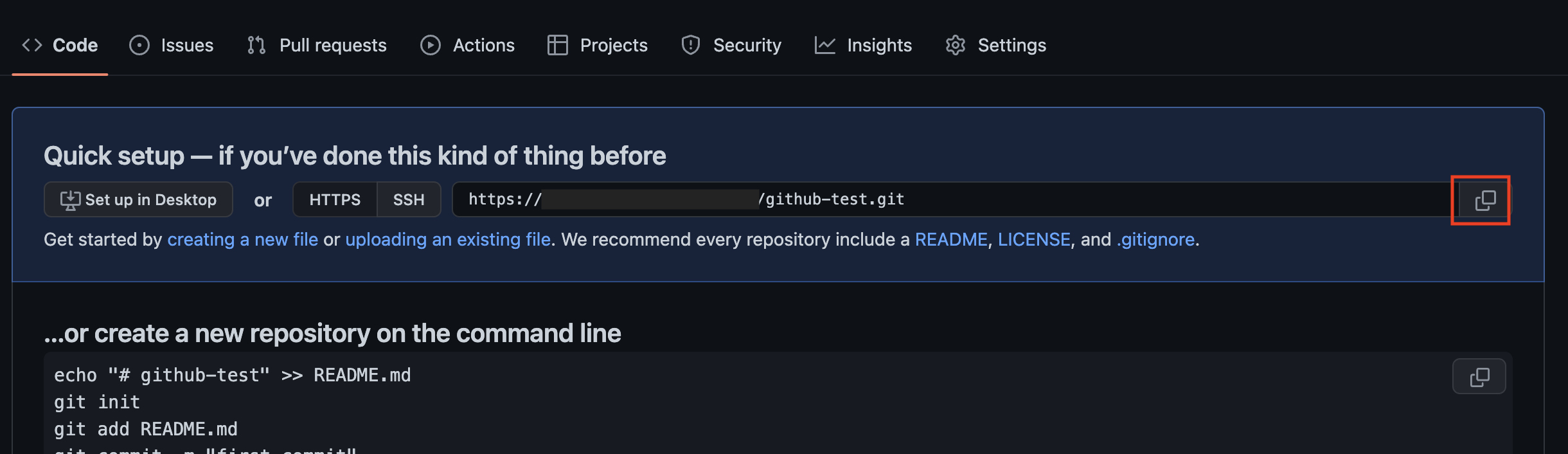 1) 지역 저장소와 원격 저장소를 연결하려면 깃허브의 저장소 주소를 알고 있어야 한다. 깃 허브 대시보드 화면에서 깃허브 주소 오른쪽에 있는 복사 버튼을 누른다.