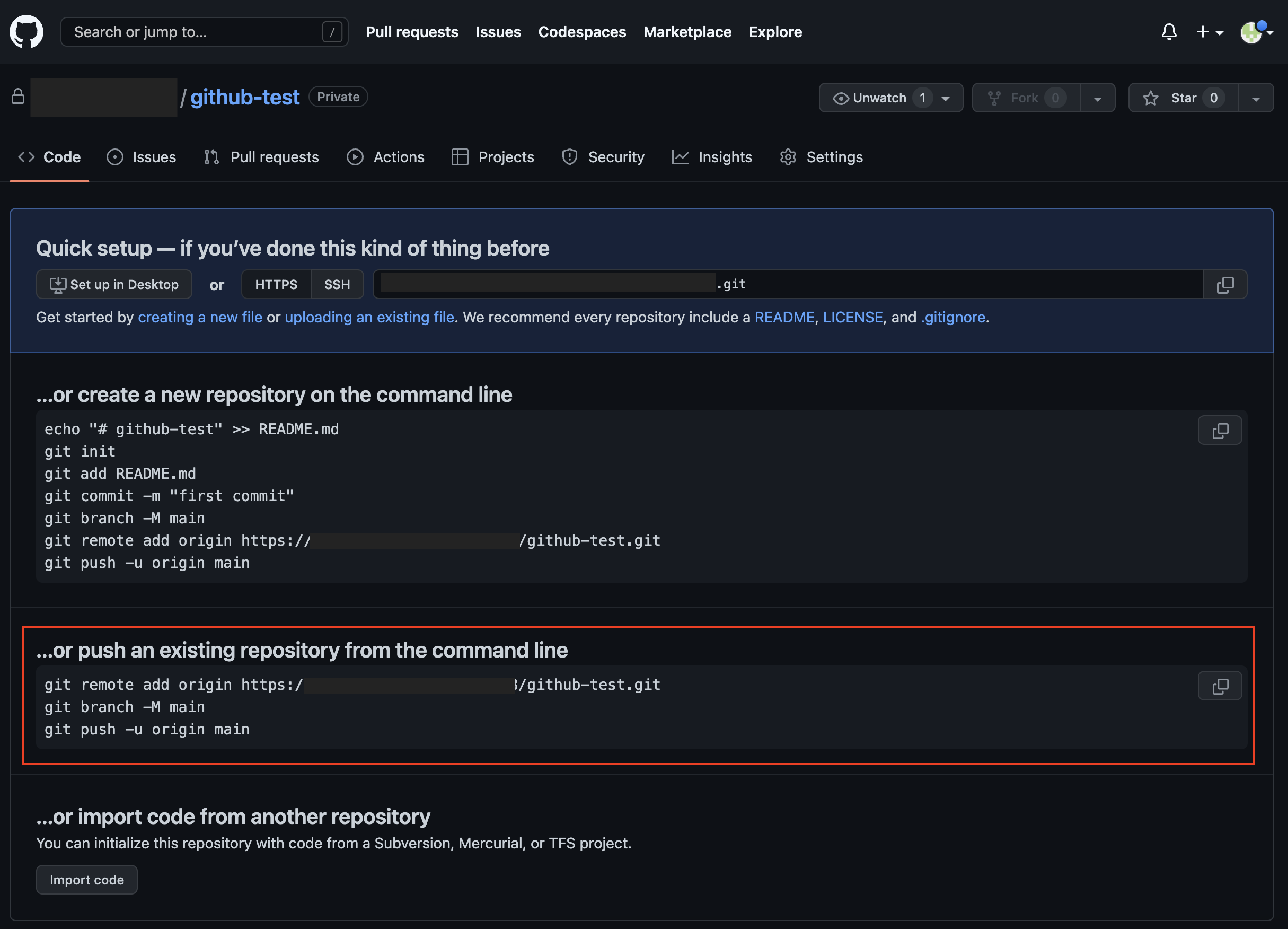 깃허브 저장소 화면에서 알려준 여러가지 접속 방법 중 '커맨드 라인에서 기존 저장소를 푸시하기(...or pash an existion repository from the command line)' 방법을 사용해서 지역 저장소에 있는 파일을 원격 저장소로 올린다.