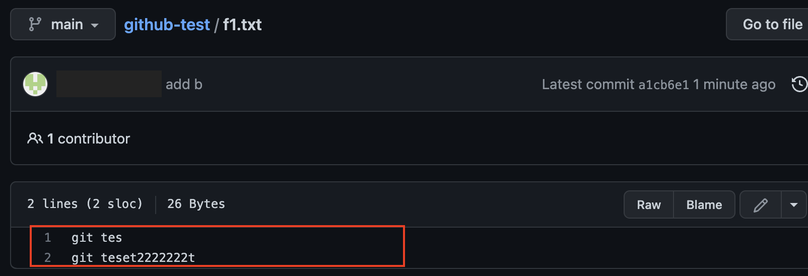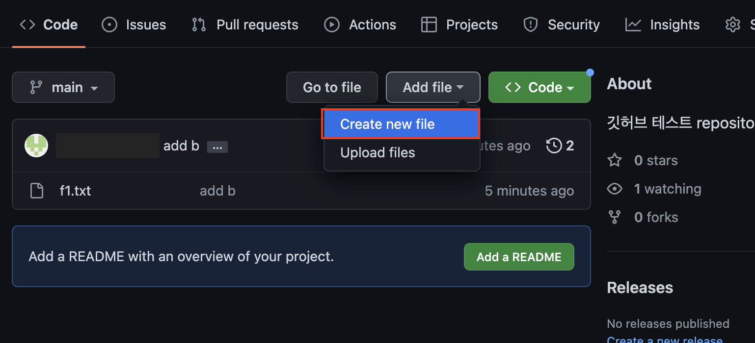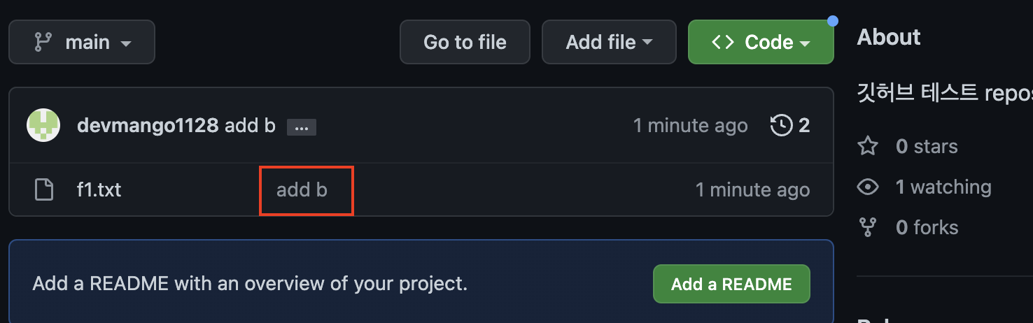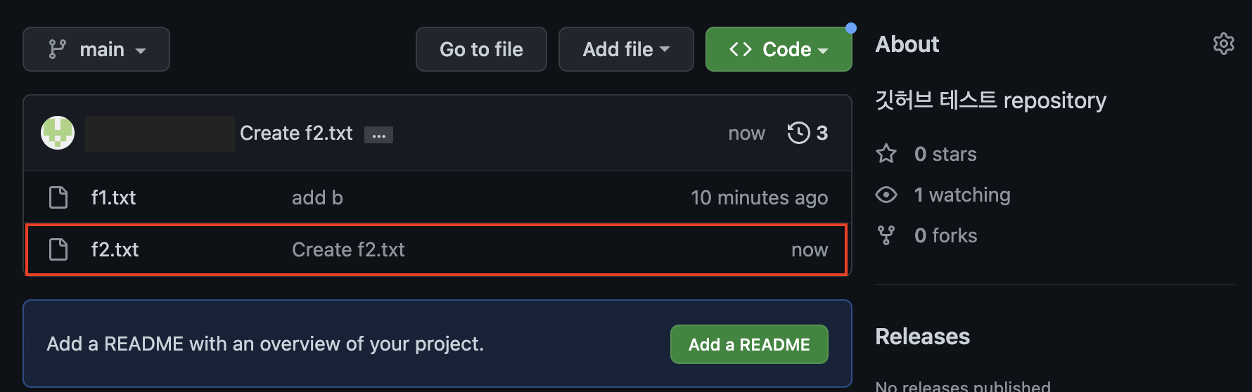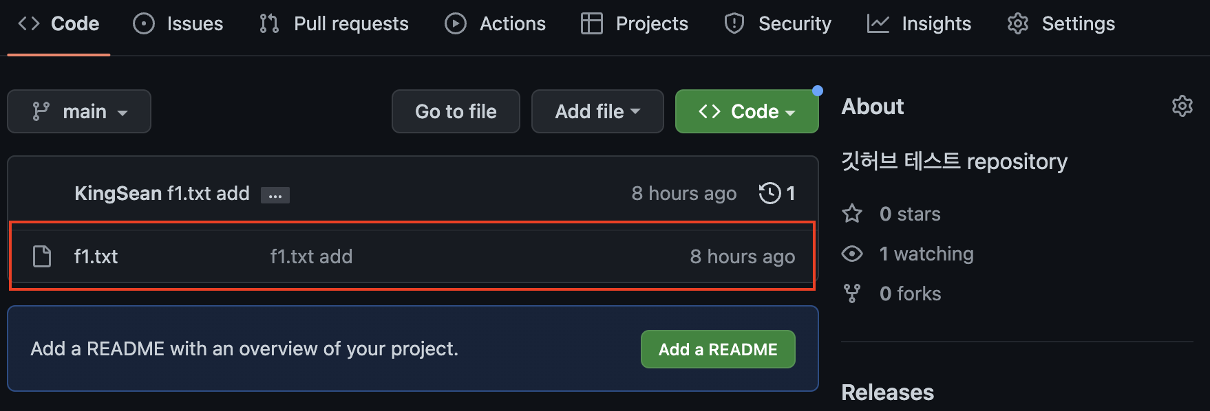 3) github 저장소에서 확인해보면 f1.txt 파일이 업로드되어 있다.