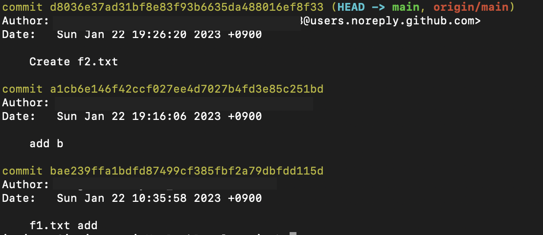3) git log 명령으로 커밋 로그를 확인 해본다. 깃허브 사이트에서 만들었던 f2.txt 커밋 메세지 로그도 확인되는 걸 알 수 있다.