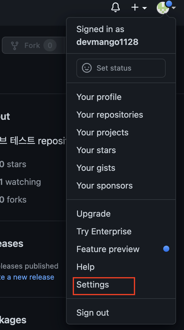 2) github 사이트에 접속한 뒤 Settings 에 들어가준다.