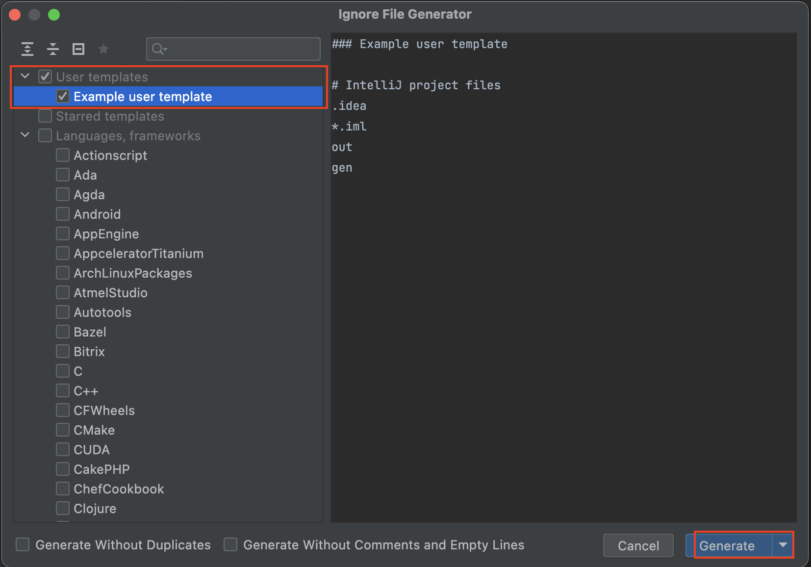 4. 여러가지를 선택 할 수 있는데 User templeates > Exaple user template 을 선택하면 해당 파일이 생성된다.
