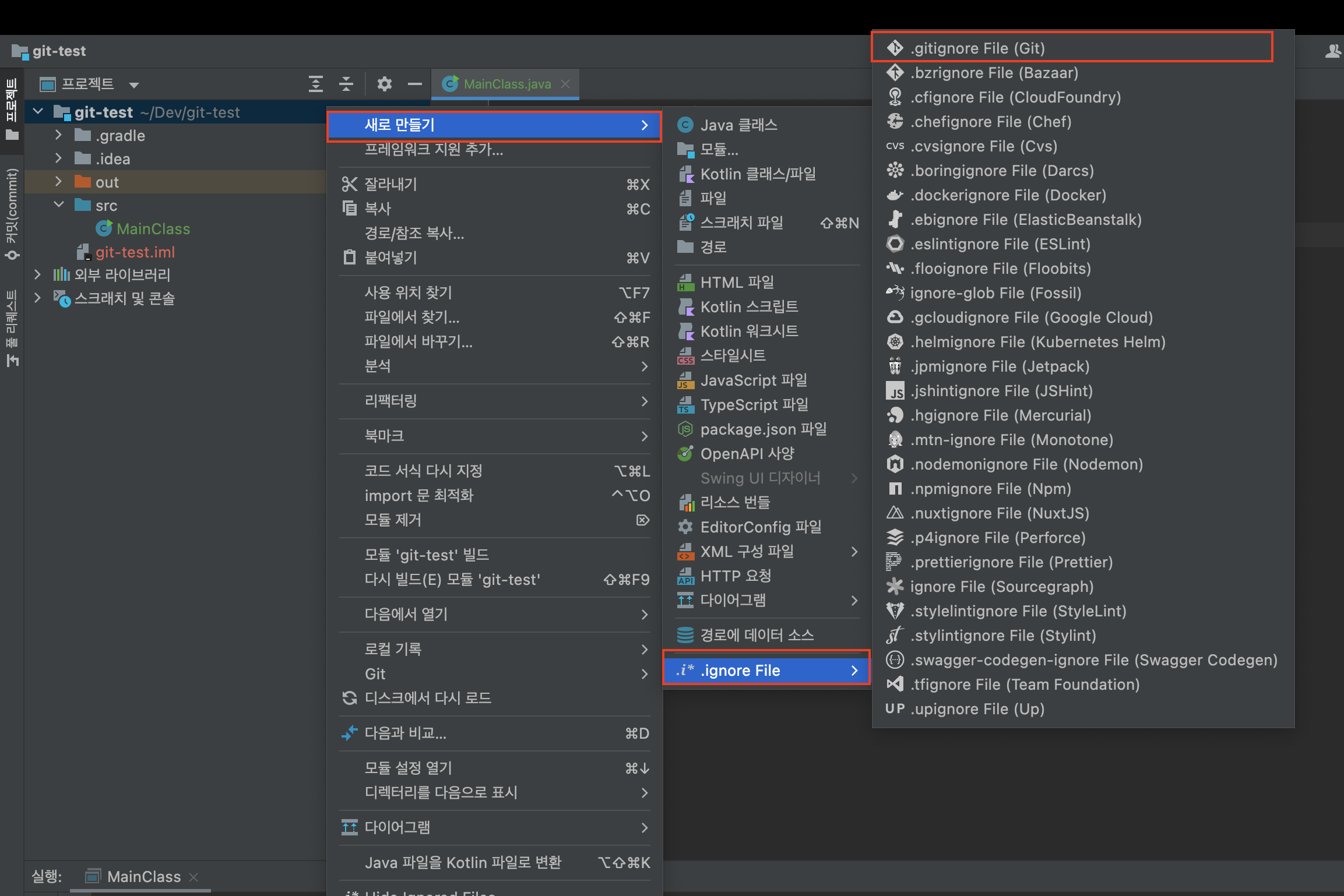 3. 설치 후 프로젝트 우클릭 > 새로만들기 > .ignore File(설치 시 보이는 메뉴이다.) > .gitignore FIle을 선택한다.