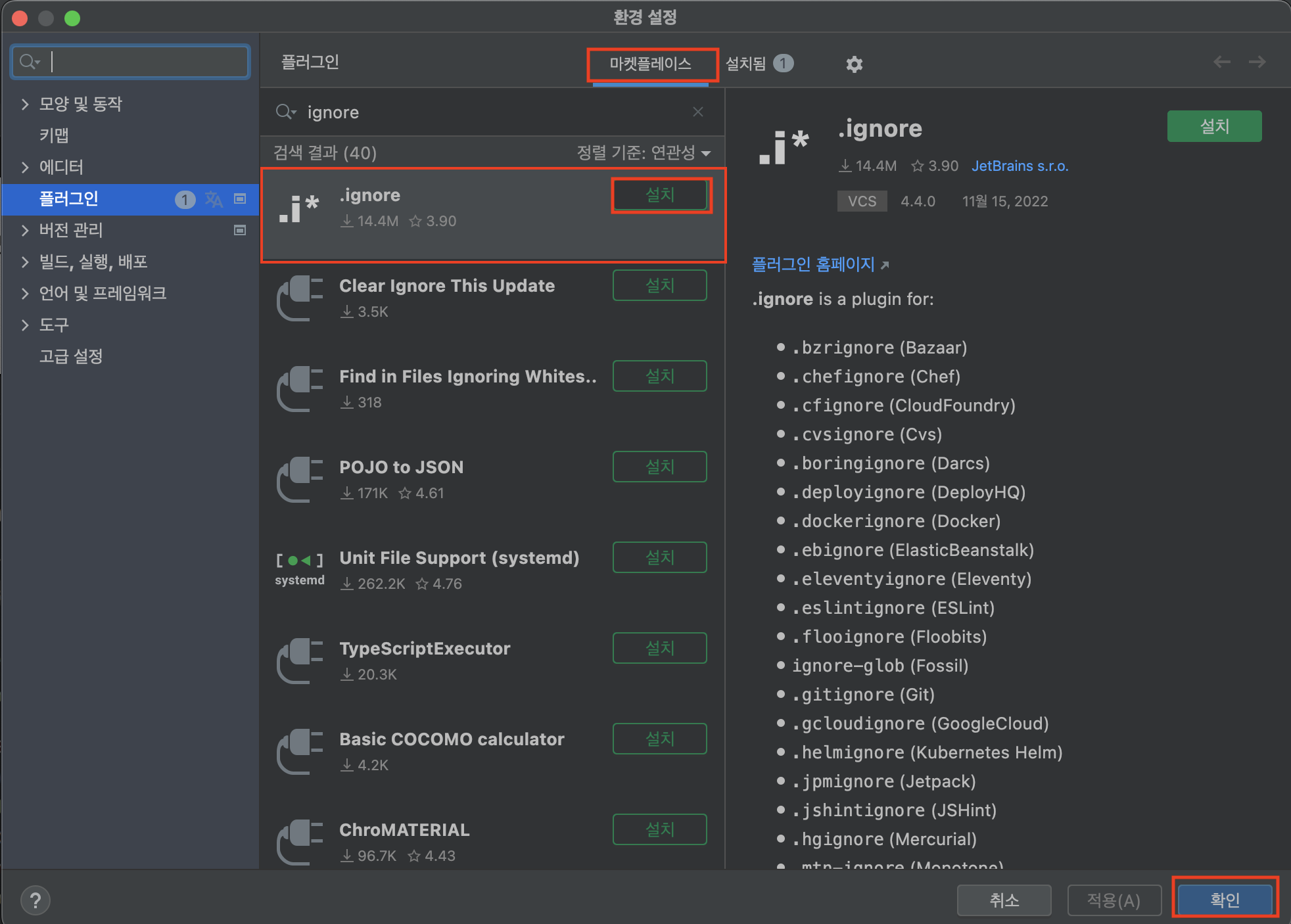 2. 플러그인에서 igonre을 검색한다. 이 때 마켓플레이스에서 검색해야 나온다. > 설치 후 확인을 클릭한다.