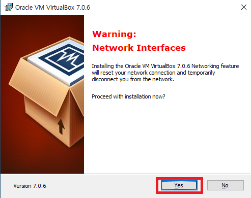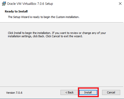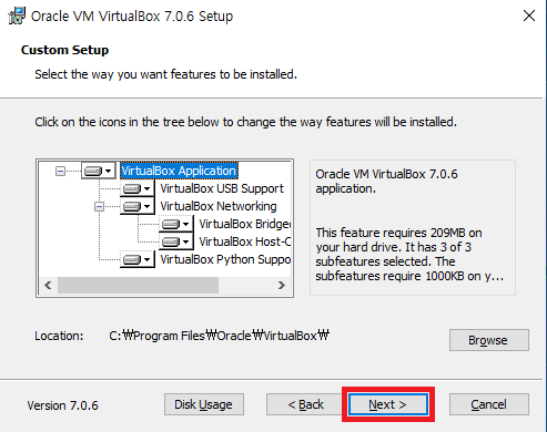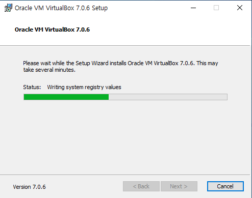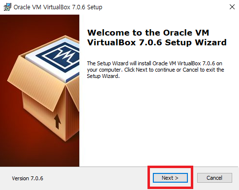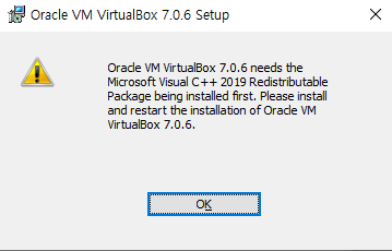 2. 다운르도 받은 파일을 설치하는데 아래와 같이 Oracle VM VirtualBox 7.0.6 needs the Microsoft Visual C++ 2019 Redistributable Package being installed first... 에러가 뜬다면 2-1로 이동한다.
