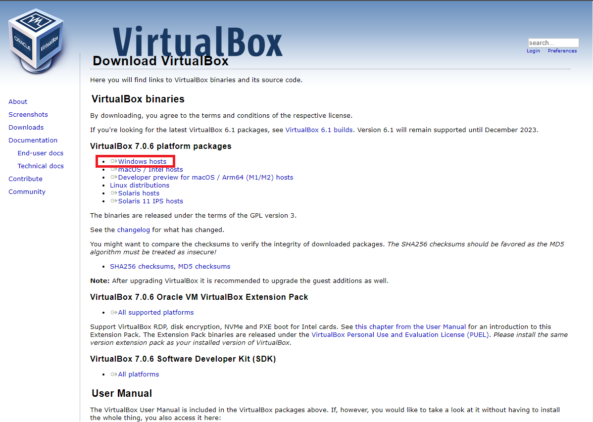 1. https://www.virtualbox.org/wiki/Downloads 에서 Windows hosts 를 다운받는다.