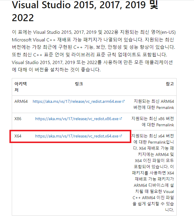 2-1. https://learn.microsoft.com/ko-KR/cpp/windows/latest-supported-vc-redist?view=msvc-170 에서 설치 파일을 다운받는다.