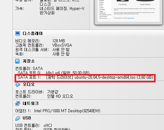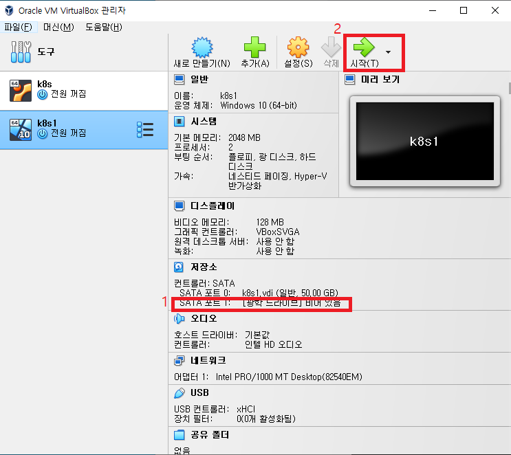 7. 상단 [설정]에서 저장소를 설정해줘도 되고, Oracle VM VirtualBox 화면에 저장소에서 '[광학 드라이브] 비어있음'을 선택하면 ISO 파일을 선택할 수 있다. 1번에서 다운로드받은 iso 파일을 불러온 후, 상단 [시작] 버튼을 클릭한다.