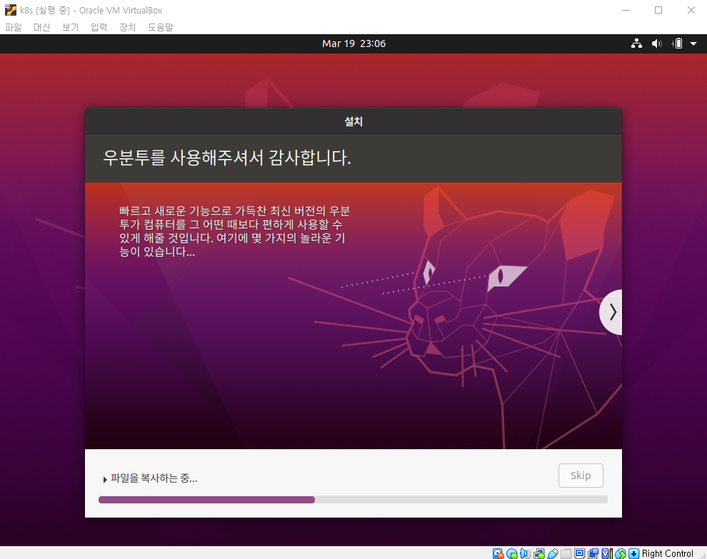 14. 자동으로 필요한 설치 파일들이 설치되며, 우분투 설치가 완료된다.