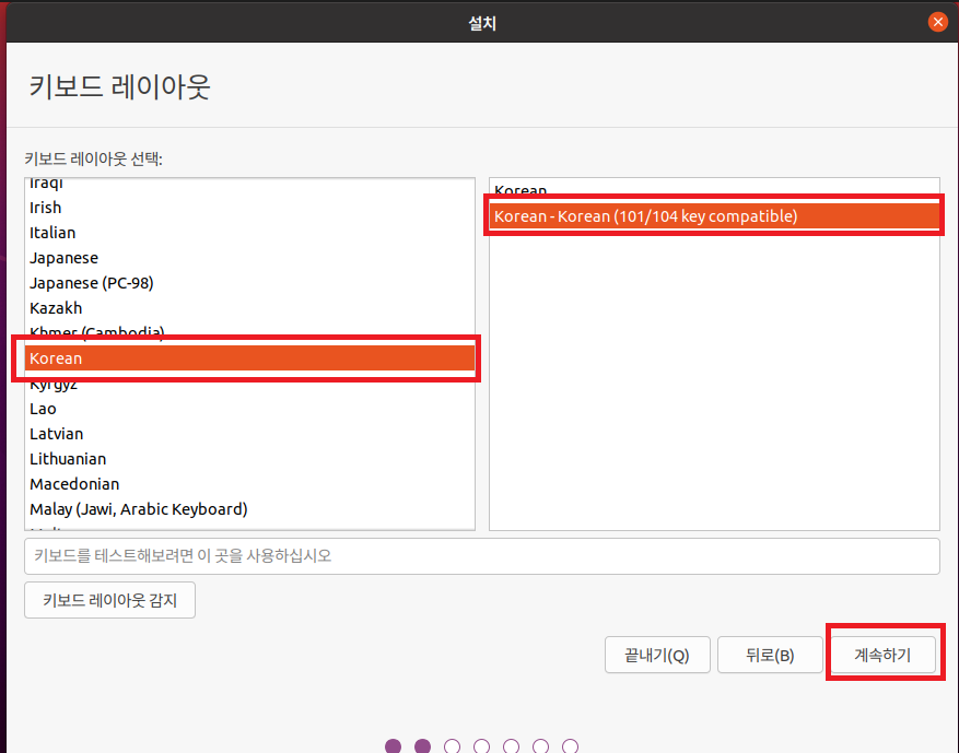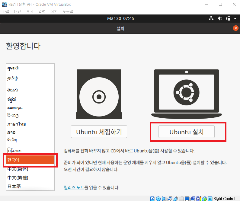 8. 우분투 설치가 시작되고, 아래와 같은 화면이 나오면 한국어를 선택한 후 [Ubuntu 설치]를 선택한다.
