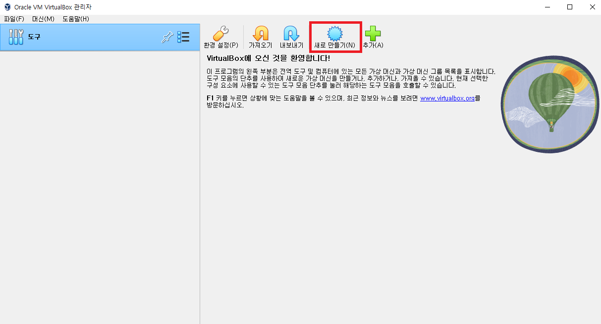 2. Oracle VM VirtualBox 를 켠다. > [새로 만들기 버튼]을 클릭한다.