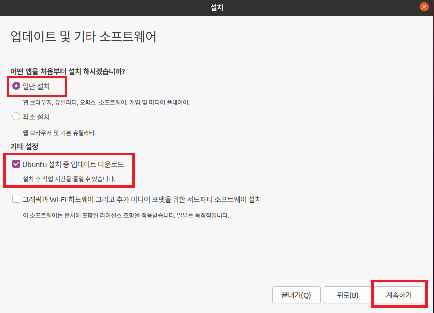 10. 일반설치, Ubuntu 설치 중 업데이트 다운로드를 선택한다.