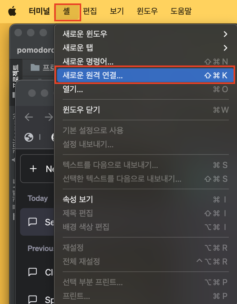 1. command + space bar ▶︎ 터미널 ▶︎ 좌측 상단 메뉴 셸 ▶︎ 새로운 원격 연결