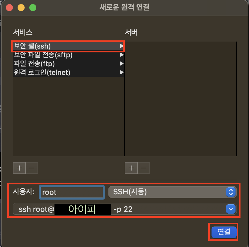 2. 보안 셸(ssh) ▶︎ 사용자에 root 입력 ▶︎ ssh root@부여받은ip -p 22 를 적고 연결을 눌러주면 접속된다.