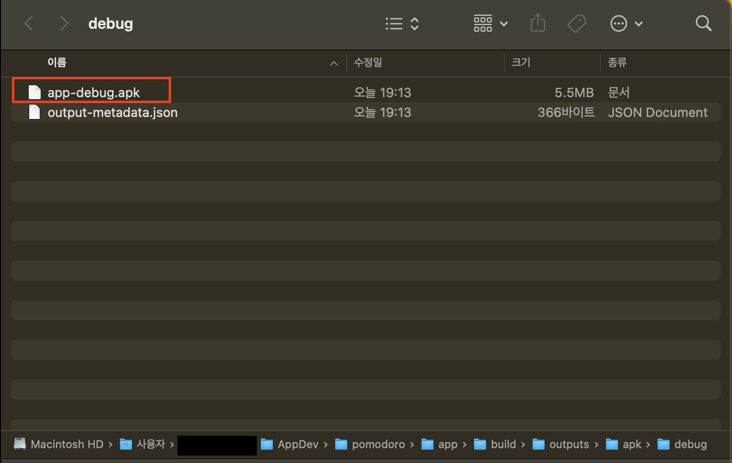 2. 프로젝트 폴더 > app > build > outputs > apk > debug 폴더에 app-debug.apk 파일이 생성된다.