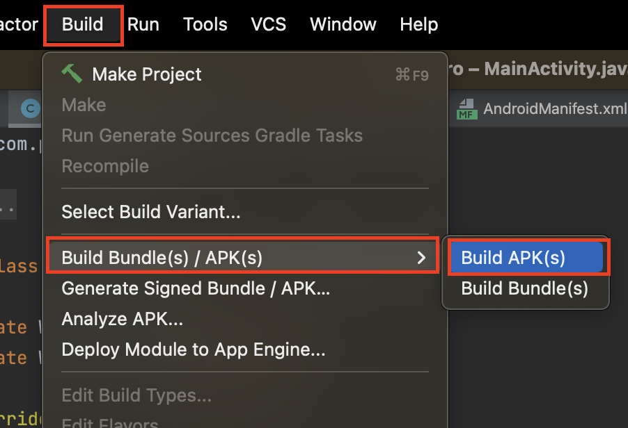 1. Build > Build Bundle(s) / APK(s) > Build APK(s) 선택