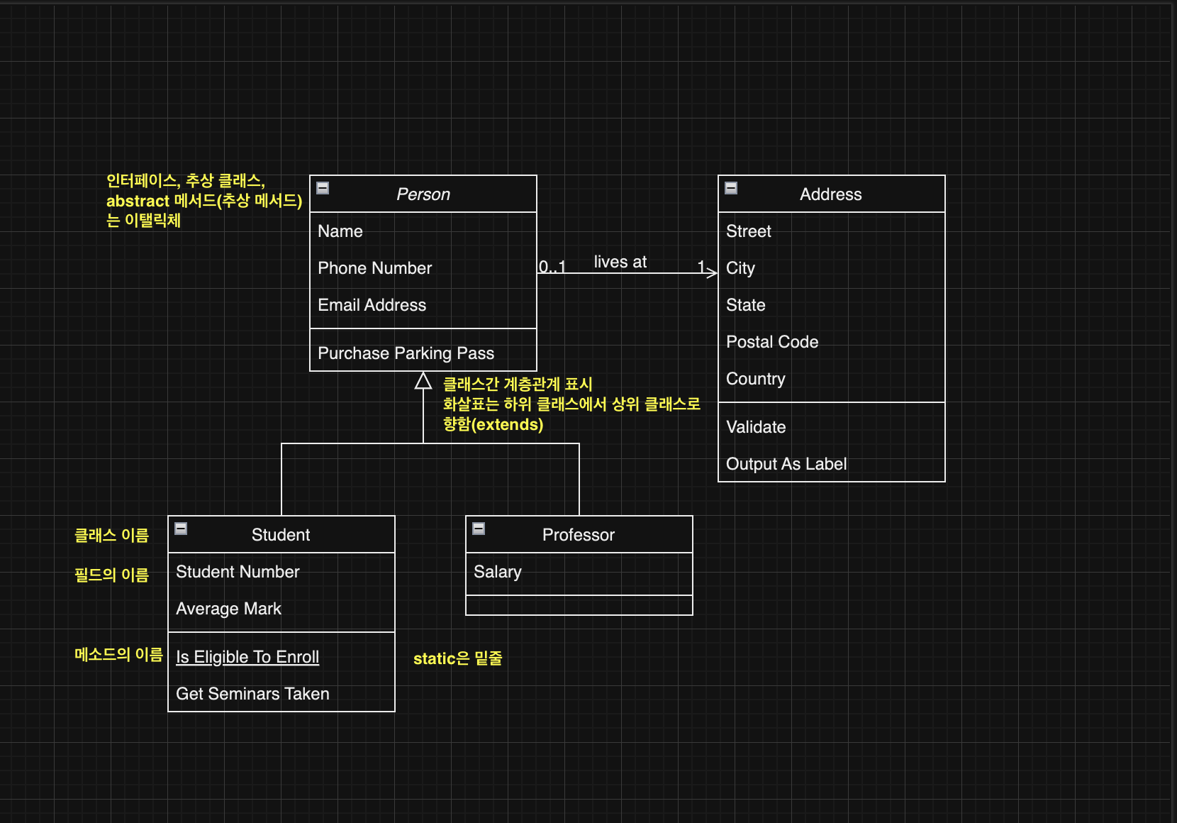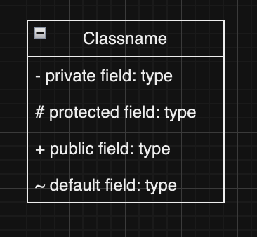 - UML의 클래스 다이어그램(Class Diagram)은 클래스나 인스턴스, 인터페이스 등의 정적인 관계를 표현