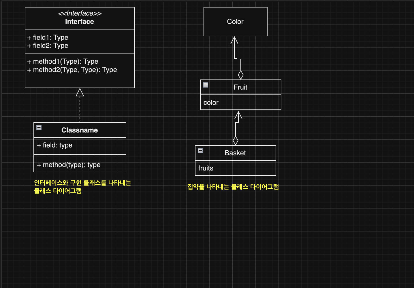 - 점선의 화살표는 인터페이스와 구현 클래스의 관계를 나타내고 있음. 화살표는 구현 클래스에서 인터페이스로 향하고 있음.(implements)