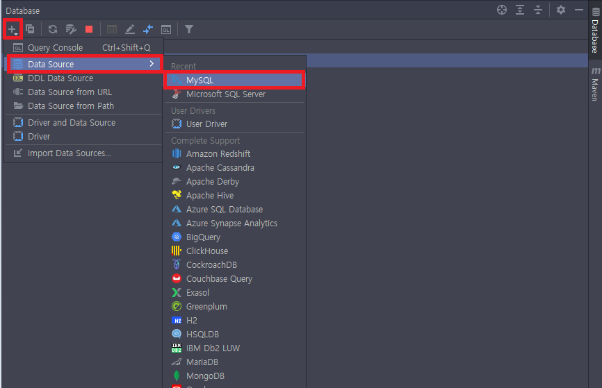 2. 좌측 [+] 버튼 클릭 ▶ Data Source ▶ [연결하려는 DBMS 선택]
