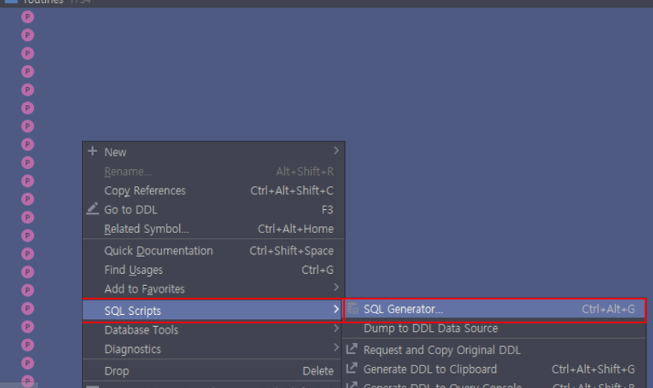 3. 선택한 프로시저 선택 후 마우스 우클릭 ▶ SQL Scripts ▶ SQL Generator… 선택