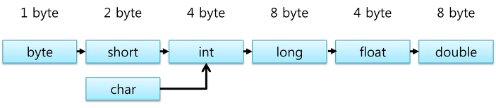 - 자동형변환(묵시적형변환) : 작은 범위의 데이터를 큰 범위의 데이터에 할당하는 경우 JVM이 자동적으로 형변환을 수행한다.