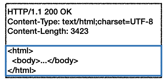 | HTTP/1.1 200 OK Content-type:text/html;charset=UTF-8 Content-Length:3423 <html> <body>...</body> </html> |