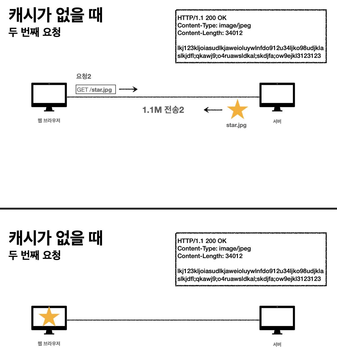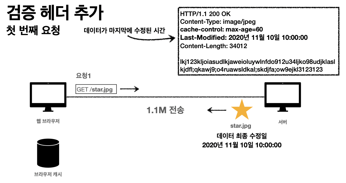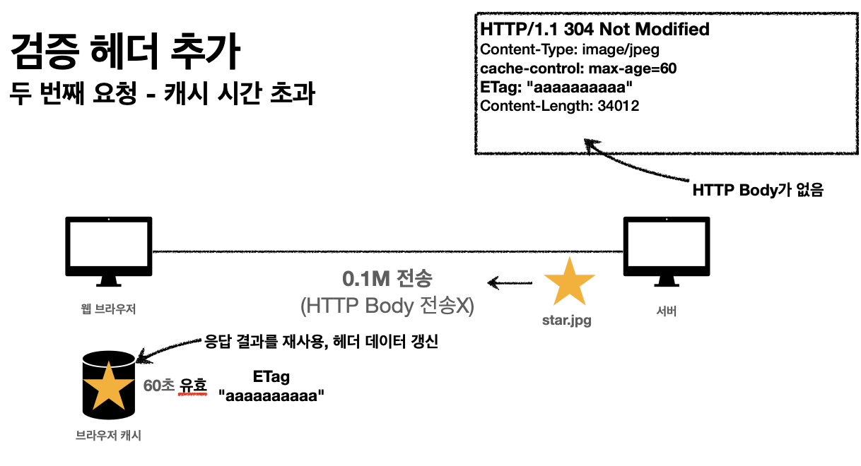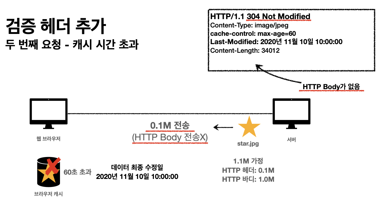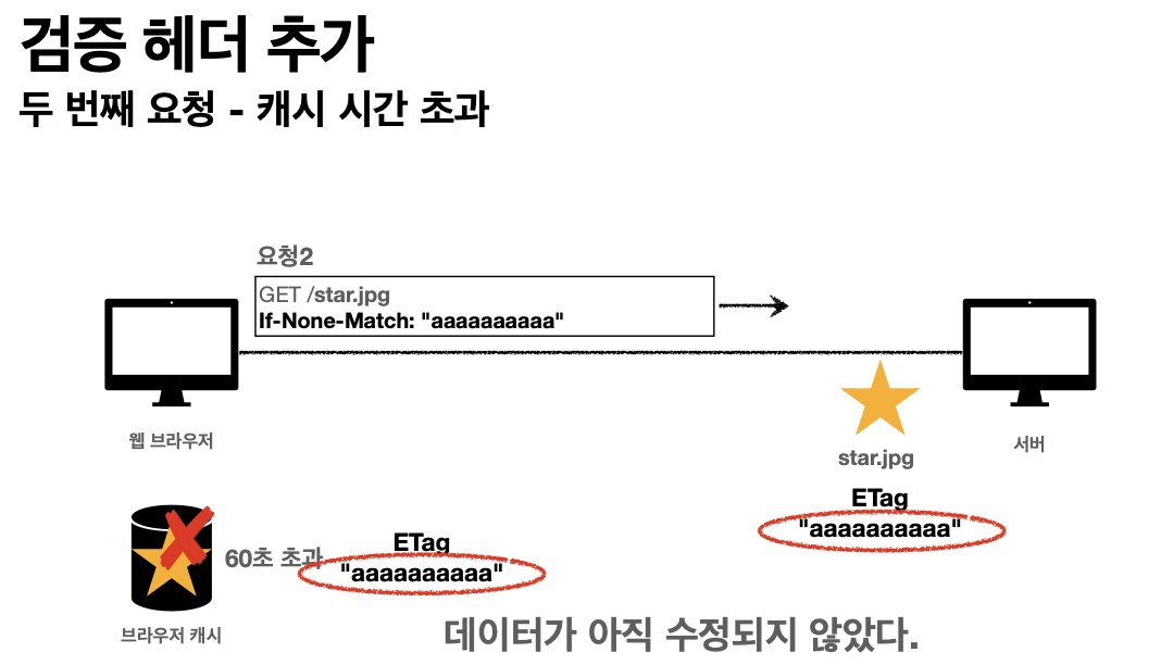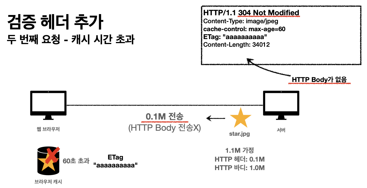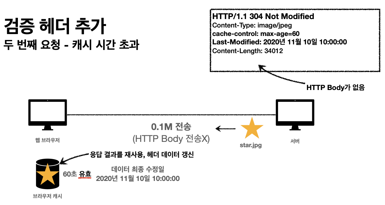 - 캐시 유효 시간이 초과해도, 서버의 데이터가 갱신되지 않으면 304 Not Modified + 헤더 메타 정보만 응답한다. (바디X)