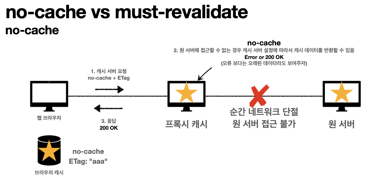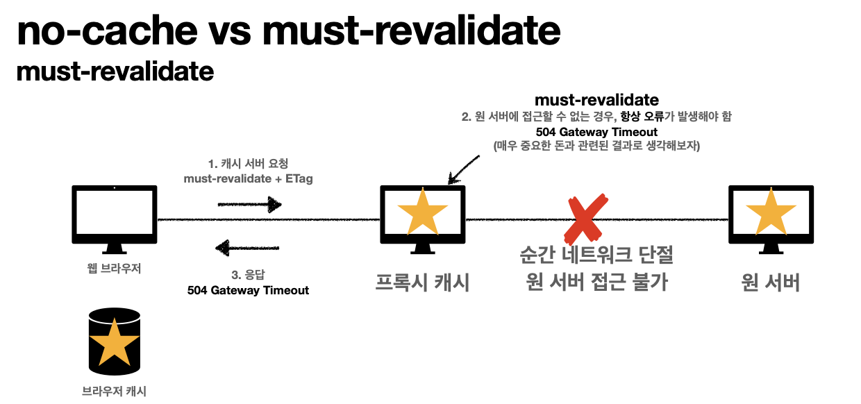 | Cache-Control: must-revalidate | 캐시 만료후 최초 조회시 원 서버에 검증해야 함. 원 서버 접근 실패시 반드시 오류가 발생해야 함 - 504 Gateway Timeout must-revalidate는 캐시 유효 시간이라면 캐시를 사용함 |