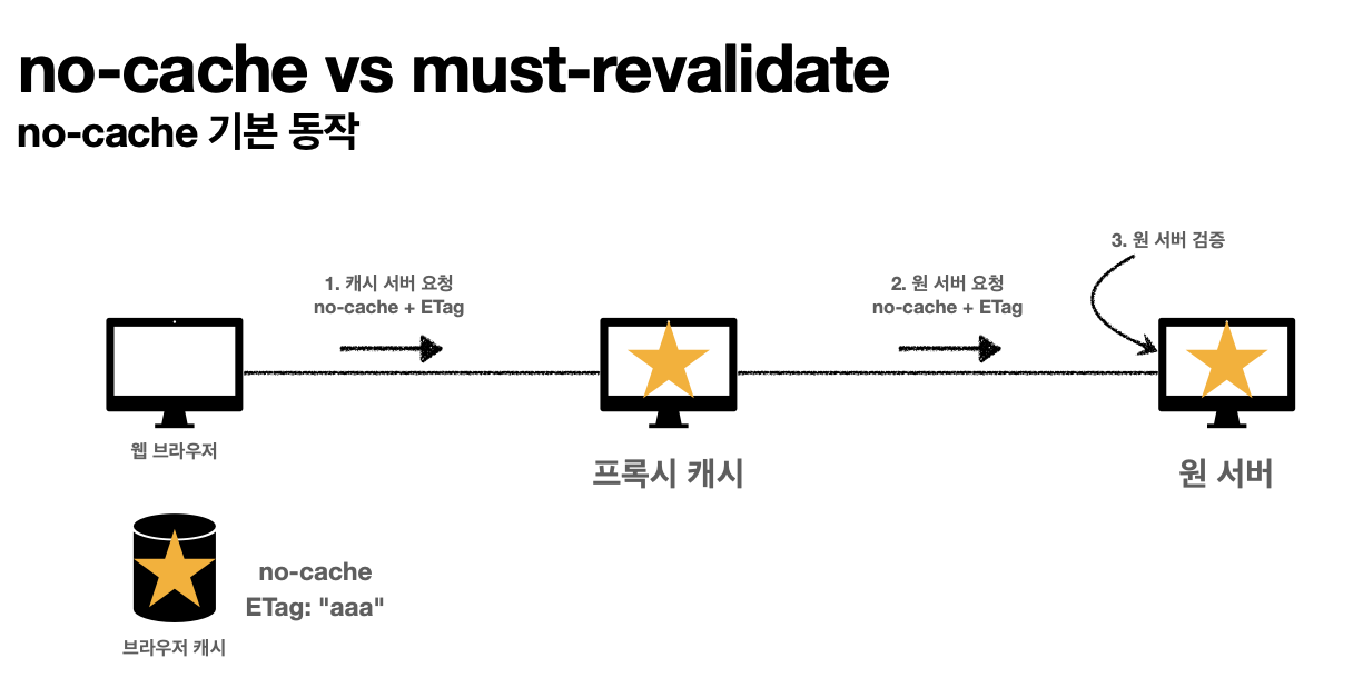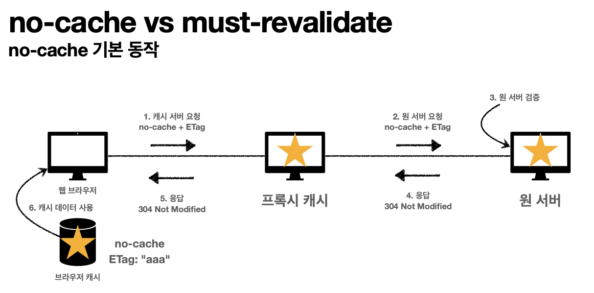 | Cache-Control: no-cache | 데이터는 캐시해도 되지만, 항상 원 서버에 검증하고 사용(이름 주의 필요) |