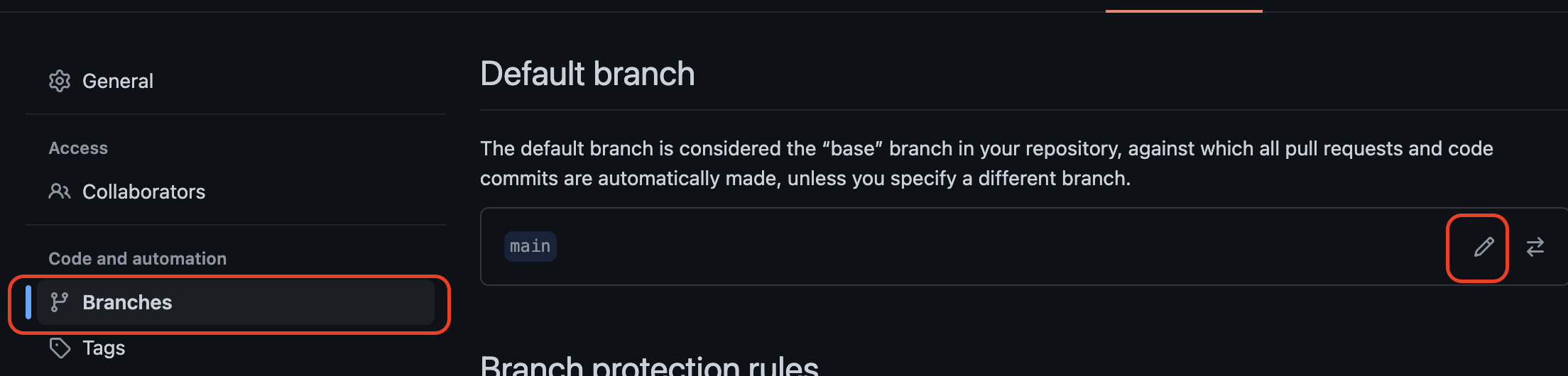 2. Default branch에 master가 입력되어 있으면 Branches - 수정(연필모양) 을 눌러서 main으로 변경해준다.