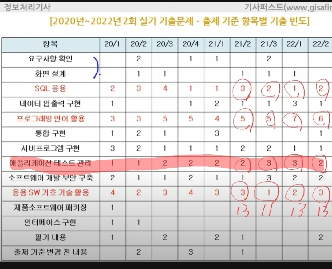 출제 빈도수를 체크해서 출제가 많이 된 과목 위주로 보고 60점만 넘기자라는 마음으로 최소 상위 5과목은 확실히 공부하고 특히 알고리즘 문제가 많아졌으므로, 자바, c언어, 파이썬은 필수로 공부하고 최대한 안 틀리도록 해야한다.