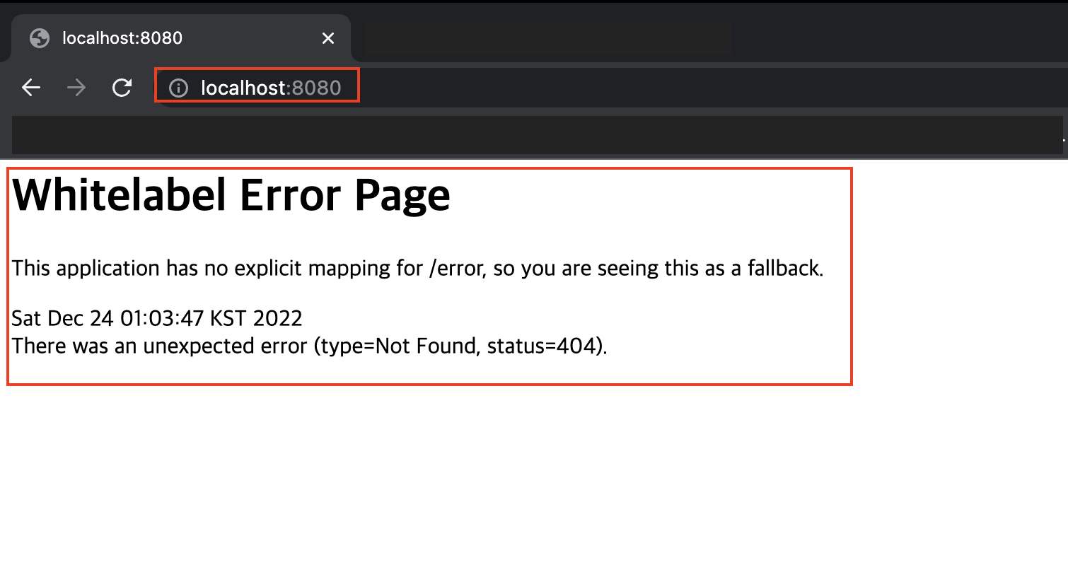 4. 웹 페이지에 localhost:8080으로 접속하면 Whitelabel Error Page가 뜨면 성공.