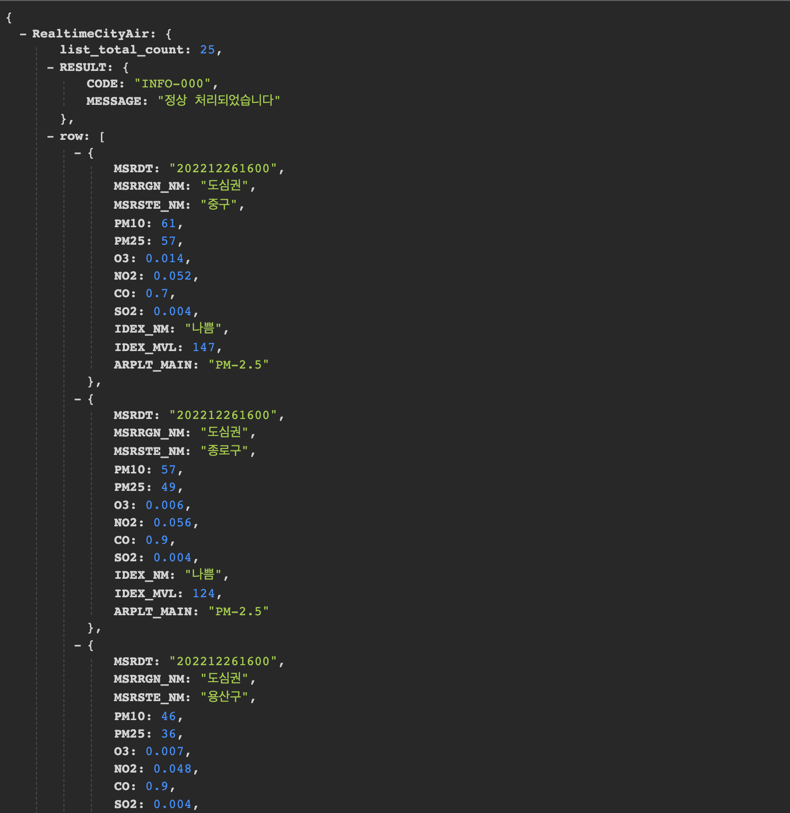 JSONVue 라는 크롬 확장 프로그램을 설치하면 아래와 같이 컬러풀하면서도 트리구조로 정렬된 JSON 을 볼 수 있다.