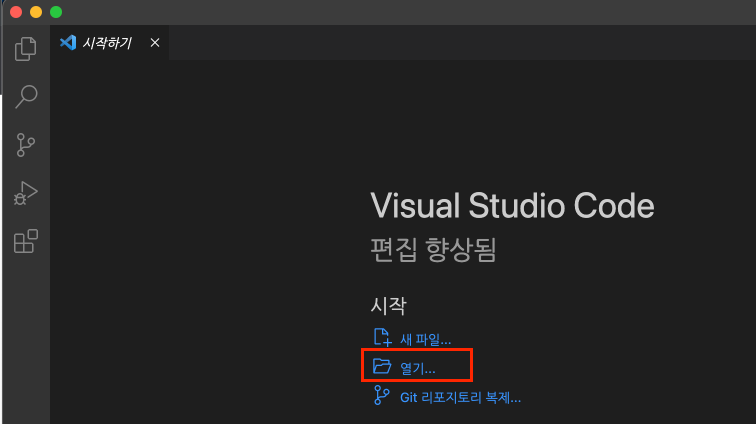 4) VSCode에서 Open folder(열기)를 이용해 작업 할 폴더를 선택한다.