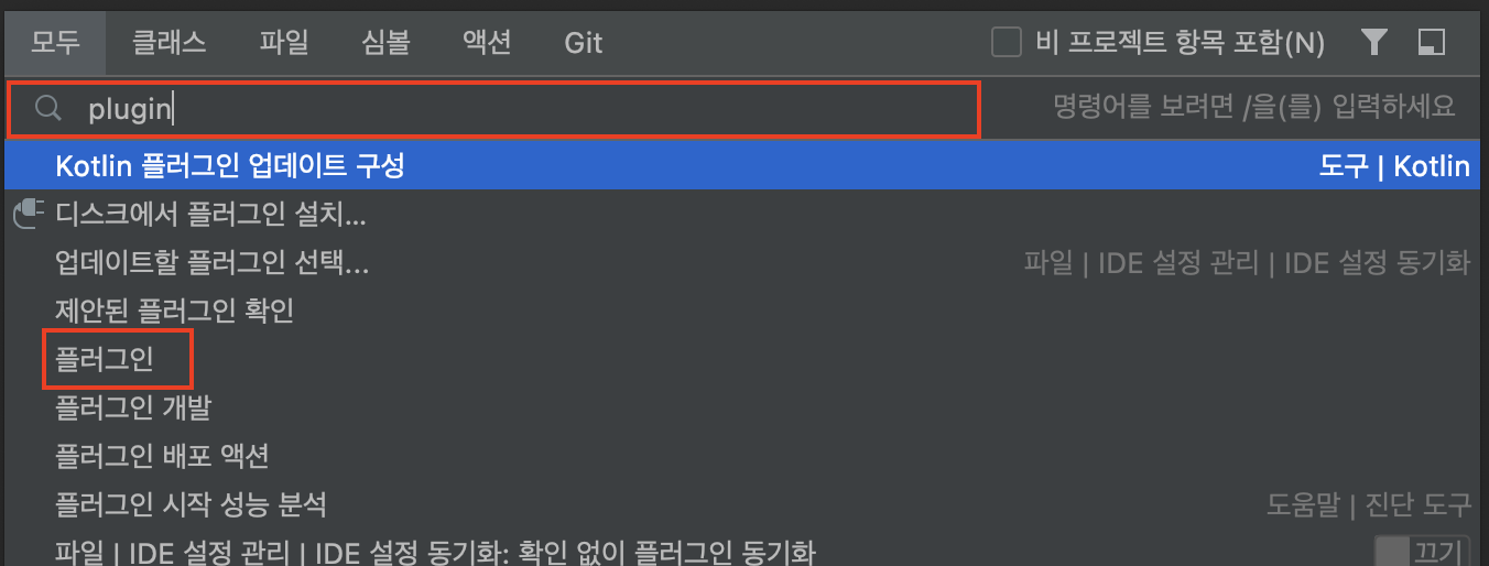 1. shift 를 빠르게 두 번 눌러준다. > 검색창에서 plugin을 입력한 후 검색 결과에서 플러그인을 클릭한다.
