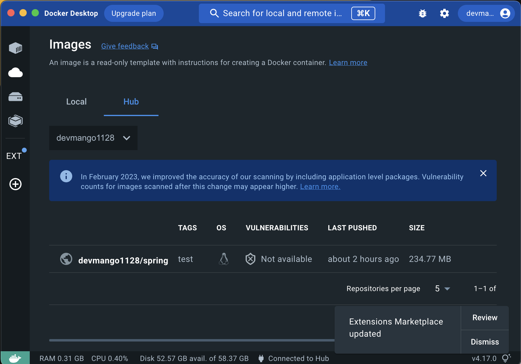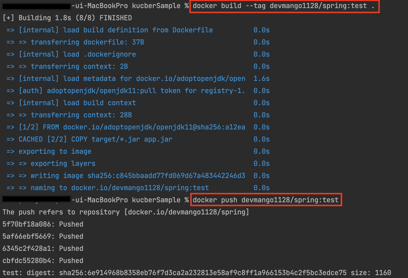 위 이미지는 davmango1128/stpring:test 인데 아래는 spring_test:test 인 이유는 m1 오류때문에 다시 테스트하고 캡쳐찍어서 그런거고 형식은 [계정]/reposiroty명:tag명 으로 입력하면 된다.