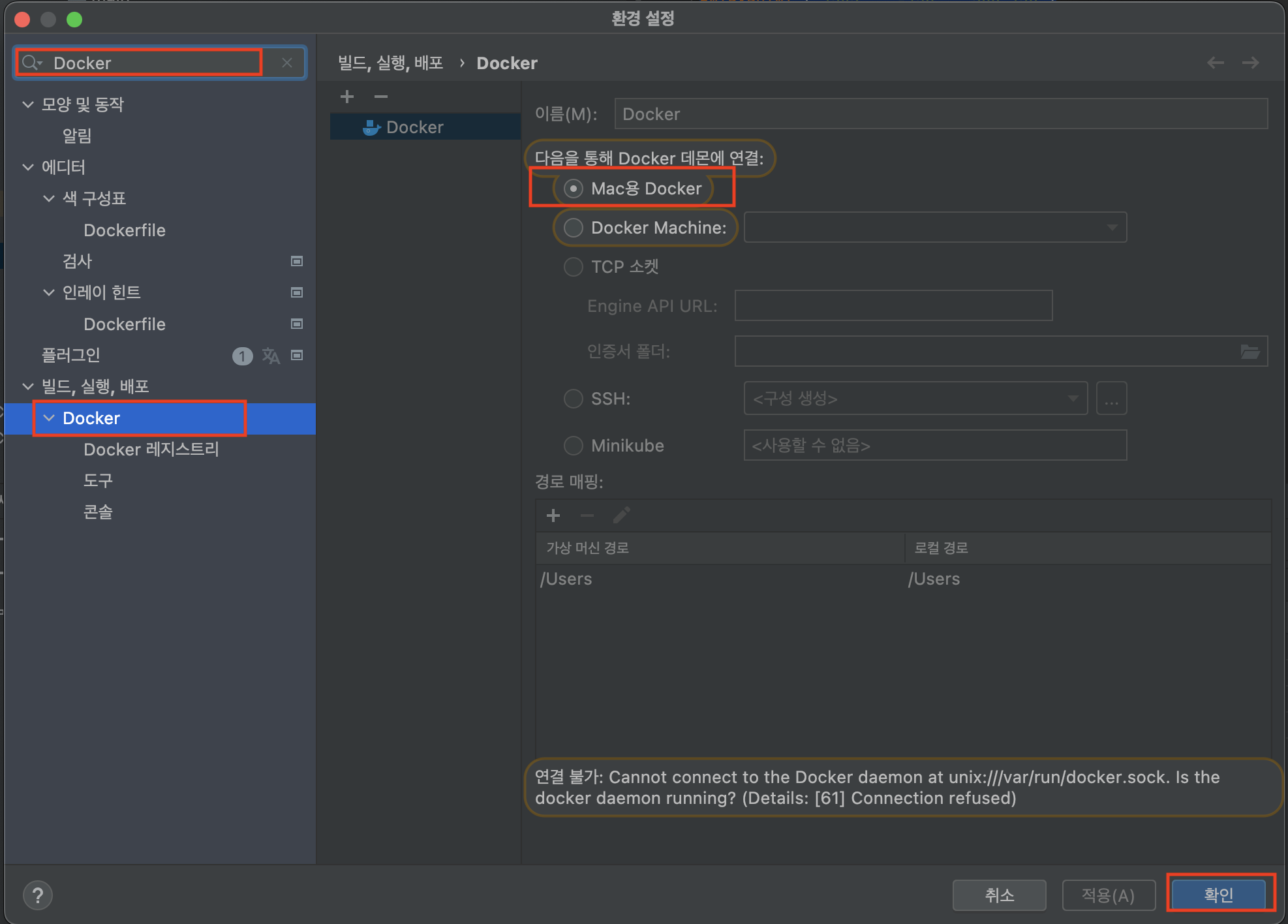 (나 같은 경우 connnect 어쩌고 저쩌고 에러가 떠있는데, 캡쳐 당시 도커 데스크탑을 꺼둔 상태여서 그렇고 도커 데스크탑이 켜져있는 상태면 상관없다.)