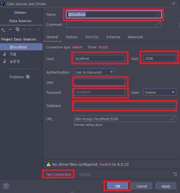 3. Host, Port, User, Password, Database를 연결한 후 Test Connection을 눌러 접속 테스트를 한 후 OK 또는 Apply를 클릭한다.